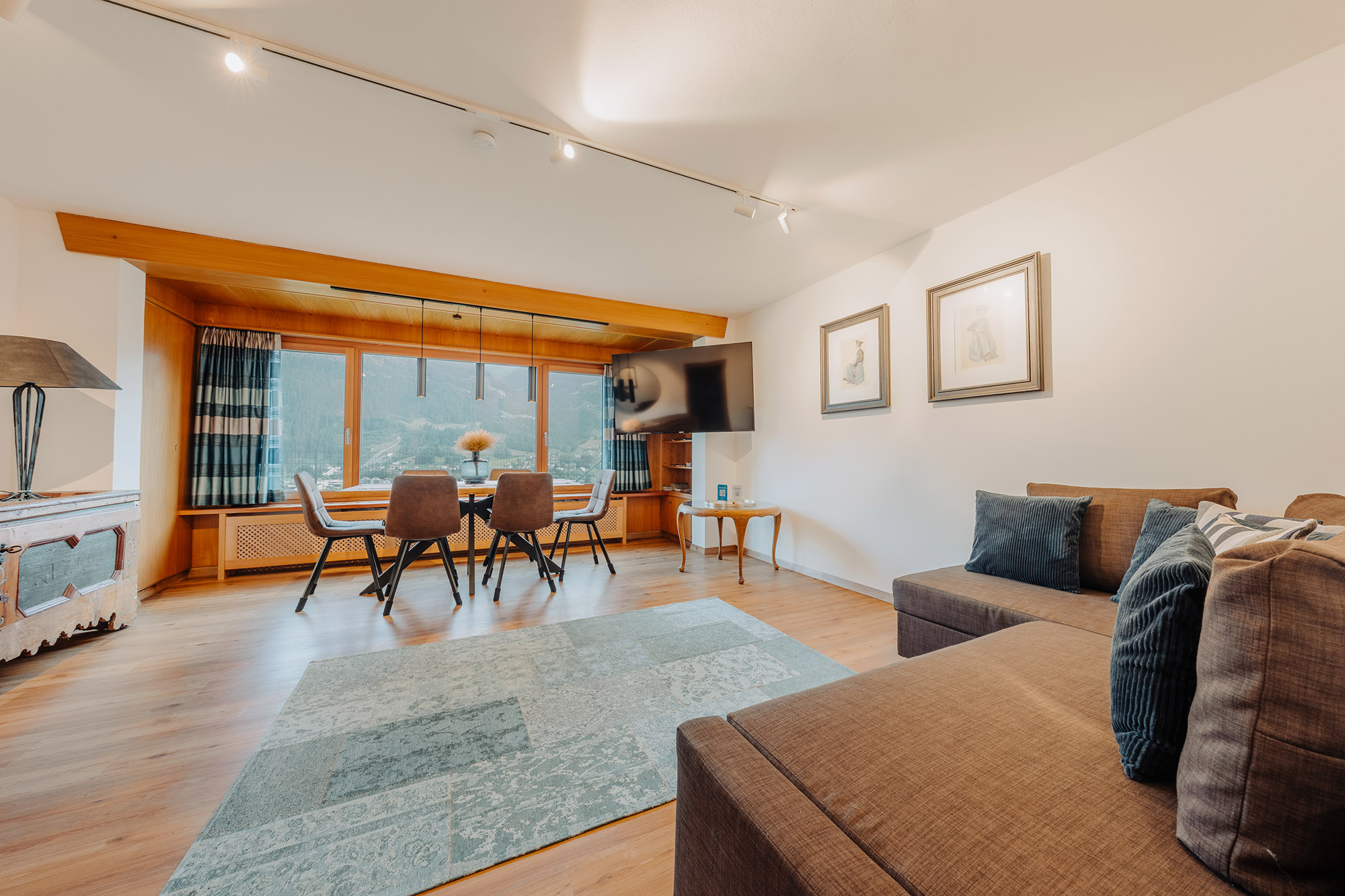 Genieße ein entspanntes Abendessen mit dem Blick über Schruns. Das große Panoramafenster im Wohnbereich bietet eine einmalige Szenerie.